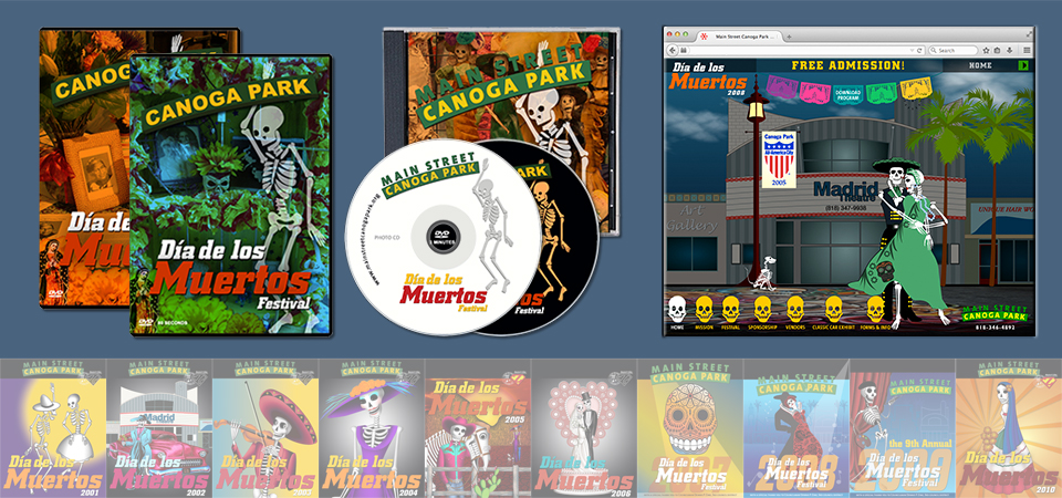 Dia de los Muertos Festival, Canoga Park, California: Annual festival websites, marketing materials & packaging, 2001 - 2010.